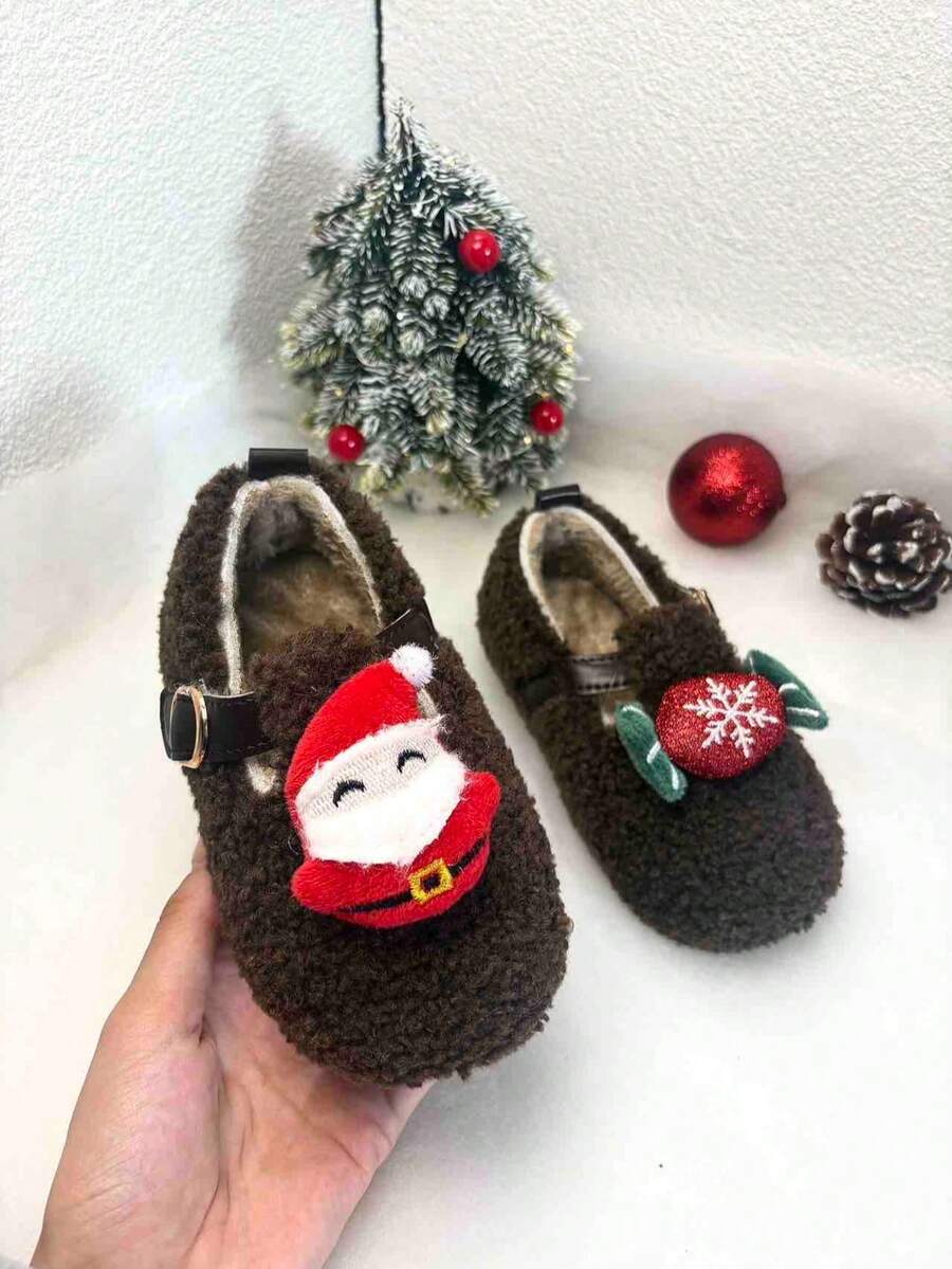 1 Paar modische, weihnachtlich-thematische Kinderflatschuhe, Dekoration mit Weihnachtsmann, Rentier, Weihnachtsbaum, thermische Fütterung für Wärme, geeignet für den täglichen Gebrauch, Einkaufen, Partys
