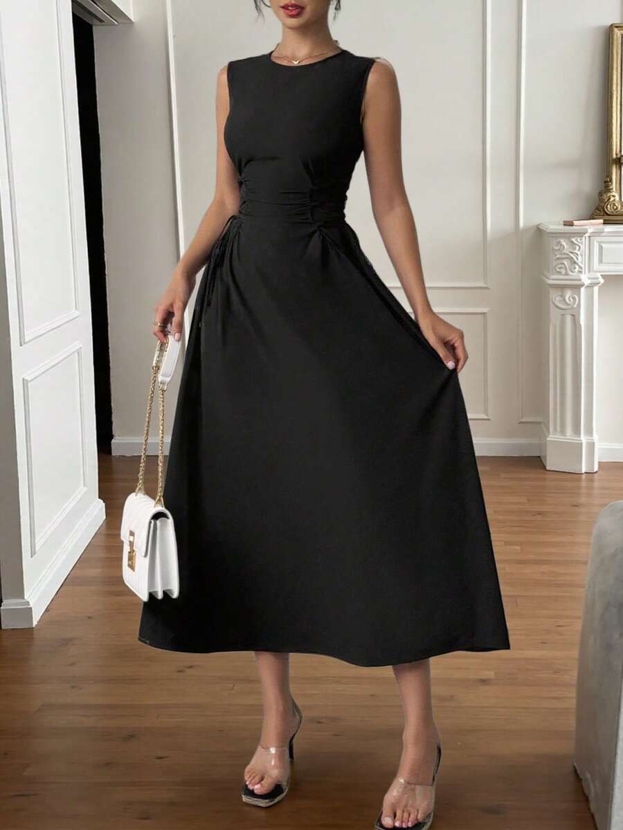 2025 Frühling/Sommer Neuer Europäischer & Amerikanischer Stil Einfarbiges Kleid mit Schnürung in Taille, elegantes Knielanges Kleid, Damen Ärmellos Hoch Tailliert A-Linie Kleid, Rundhalsausschnitt, feminin, geeignet für Alltag und Büro