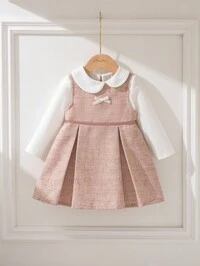 SHEIN 2 Stücke Outfit-Set für Säuglinge und Kleinkinder im koreanischen Stil – graues kurzes Hemd mit Schleifendekor und grauer Faltenrock, lässig und geeignet für den Alltag, Urlaub, Fotoshootings, Frühling/Sommer, 3M–3T, Kleinkinderkleidung für Mädchen mit Schleife, Kleidung für Säuglinge und Kleinkinder, Kleid, modisch, elegant, für Kleinkinder, Mädchen
