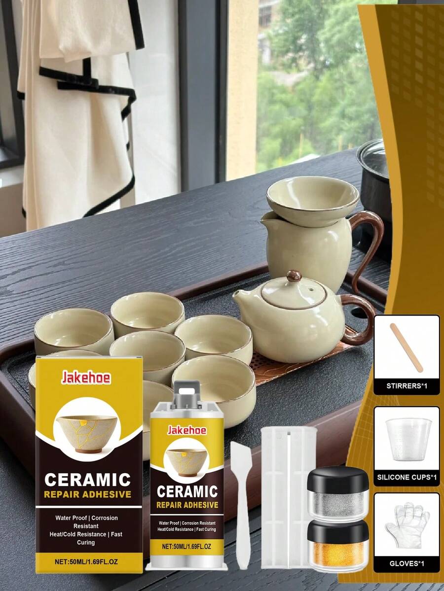 Keramik-Reparatur-Set - Goldklebstoff für tiefe Verklebung, stellt gerissenes Porzellan, Glas, künstlerische Textur wieder her. Geeignet zum Reparieren von wertvollen Keramikobjekten wie Teetassen, Vasen, verwandelt beschädigte Bereiche in künstlerische Elemente, verleiht dem Artikel eine neue Ästhetik. Verbindet schnell zerbrochene Keramik, starke Haftung nach dem Aushärten, wasserfest, schimmelresistent, hitze- und kältebeständig.