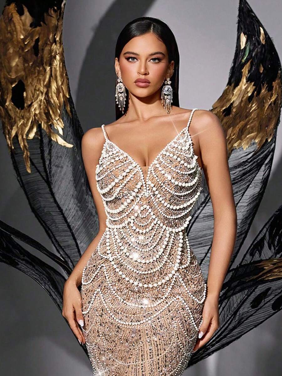 Glamouröses paillettenbesetztes, perlenbesticktes ärmelloses Meerjungfrauenkleid mit V-Ausschnitt (stark verziert)