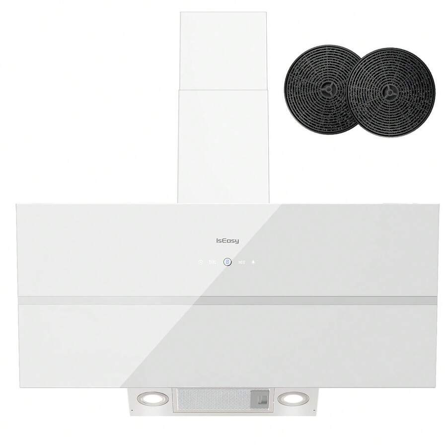 IsEasy 90 cm Dunstabzugshaube, weiße geneigte Küchenhaube, Klasse A++, 594 m³/h, 4 Geschwindigkeiten, LED-Beleuchtung, Evakuierung oder Recycling, 2 Kohlefilter enthalten [Energieklasse A++]