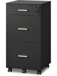 Schubladenschrank, Rollcontainer, mobiler Aktenschrank, Metallschrank, Druckertisch, abschließbar, 3 Schubladen, vormontiert, Büro, Homeoffice, 45 x 39 x 54 cm, tintenschwarz OFC63BK