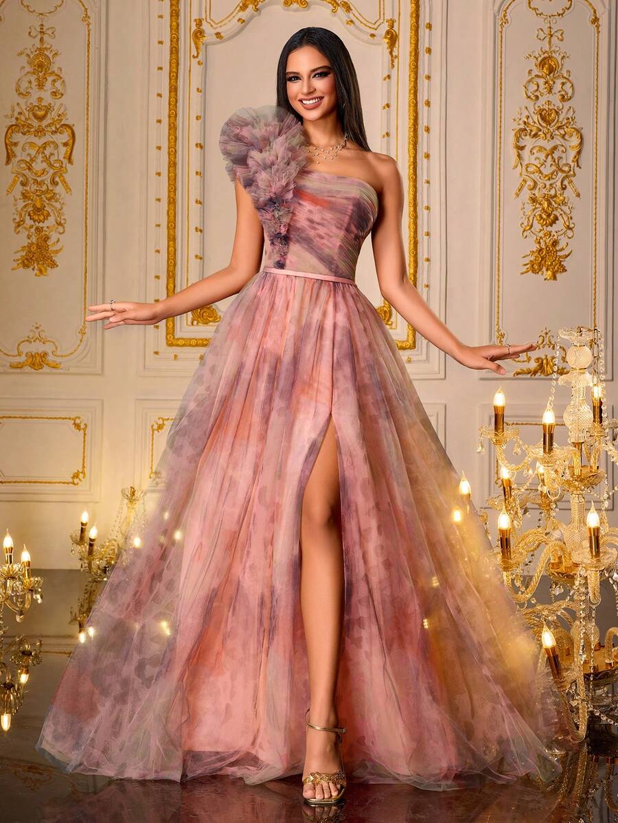 SHEIN X Hannahelzahed VIPGIRL SHEINXHannah sinnlicher einschwriger Farbverlauf Blumen Abendkleid für Frauen, Tüll Ballkleid mit Rüschendetails und hohem Schlitz, elegantes bedrucktes Abendkleid, Farbverlauf Mesh Formelles Kleid, Frauen Formelle & Abendkleider, Partykleid, Brautgast