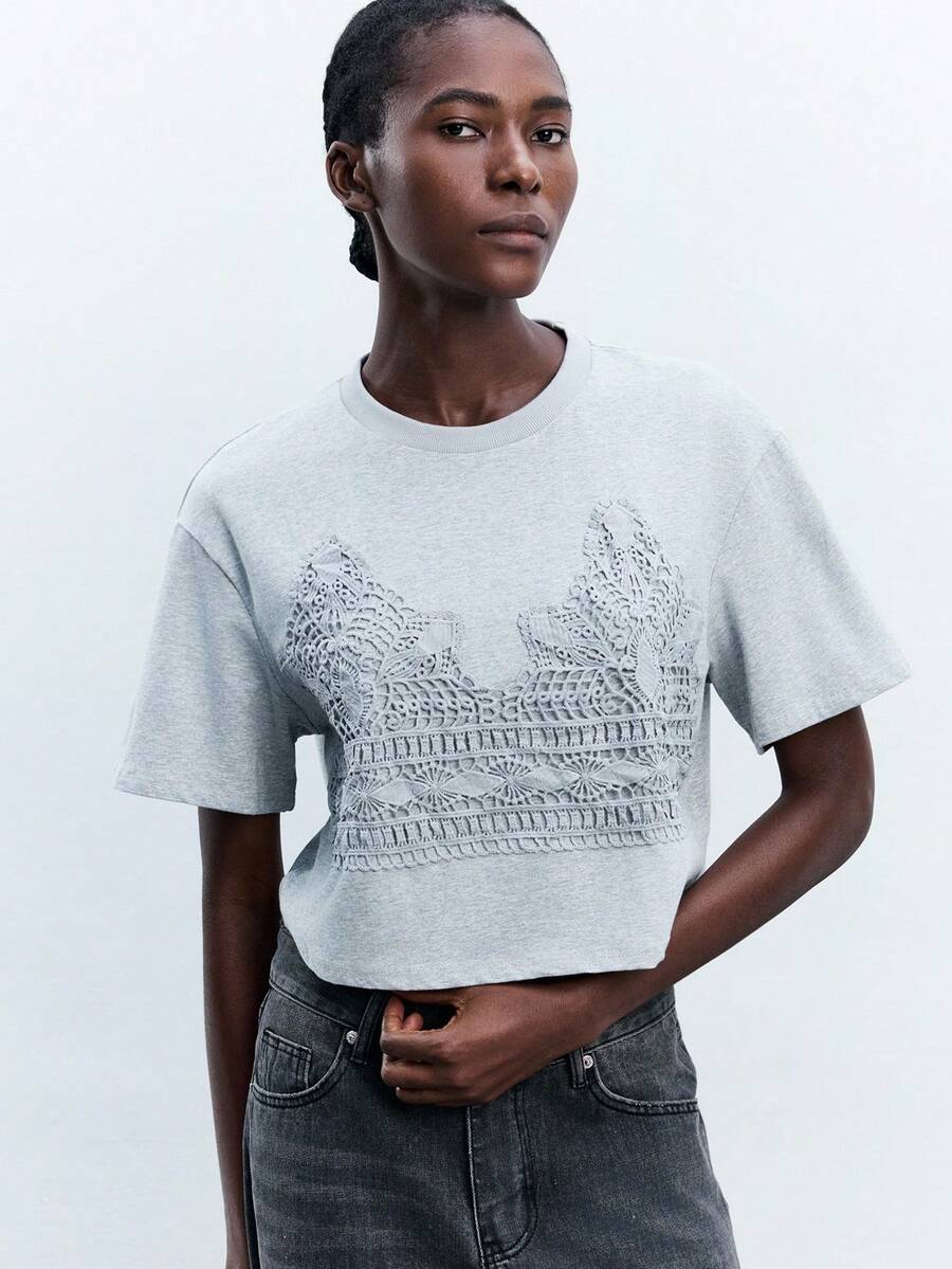 Maija Damen Rundhals Top mit Spitzenbesatz und Kurzarm, minimalistisch elegante Mode für den urbanen Arbeitsweg, Business Lässig, Lehrerin Uniform, Bürokleidung, Schuloutfit, Basic Pullover, Vintage Stil