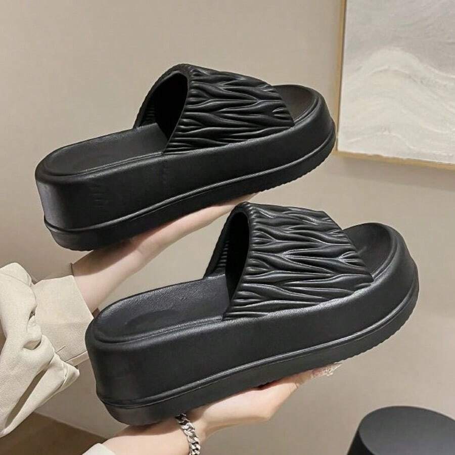 Damen Super Weiche EVA Leichte Komfortable Tanga Sandalen, Einfarbig 7cm Plateau, geeignet für Teenager, Sommer, Farbe Schwarz