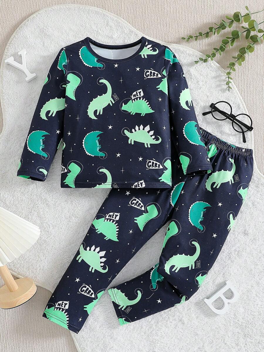 Bequemer Schlafanzug-Set mit Langarmshirt für Kleine Jungen mit digitaldruck Dinosaurier-Motiv (leuchtet im Dunkeln unter UV-Licht)
