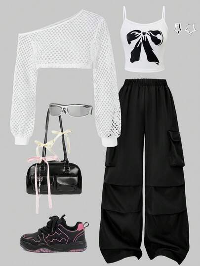 Sparklyn 3 Stücke bequemer Strick-Camisole, Träger & weite Hose Set, geeignet für Outdoor-Sport, Lässig & Alltag, schräge Schulterdesign